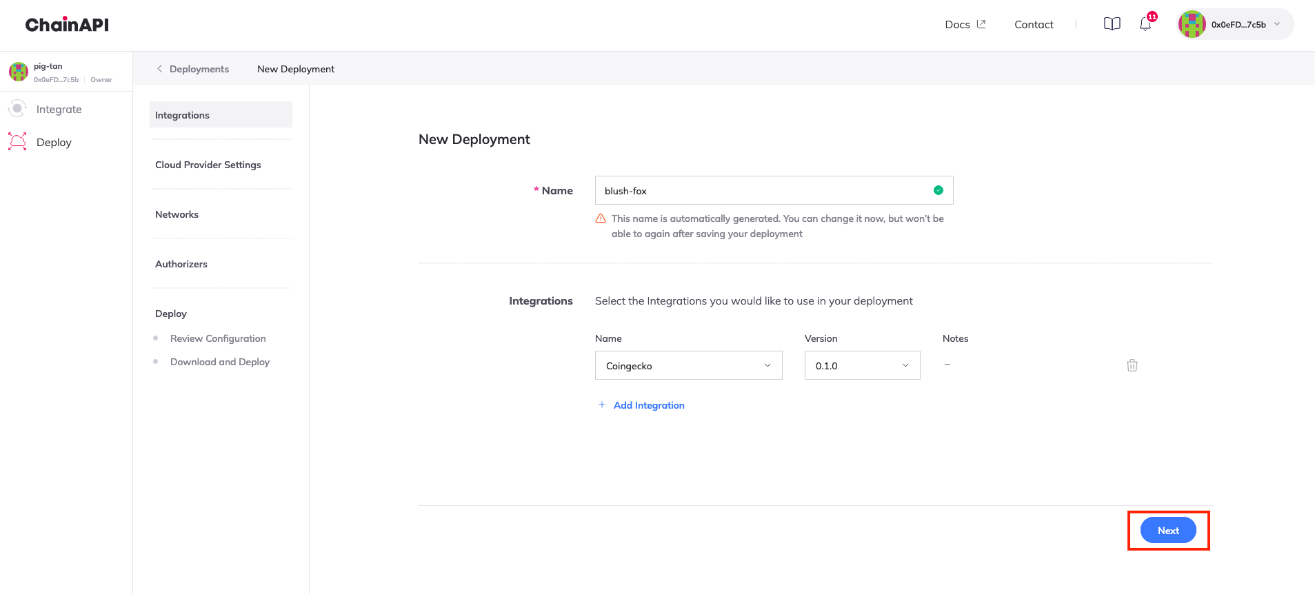 Enter your deployment name and select the integration you would want to use with the deployment. Click on Next.