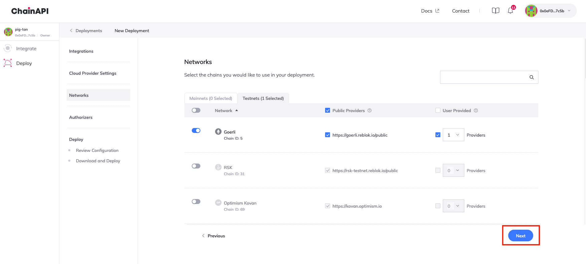 Select the chains you would want to use your Airnode on. You can choose any of the supported chains (Mainnets/Testnets) with up to 10 custom providers for each chain. Click on Next after selecting the chains and the number of providers.