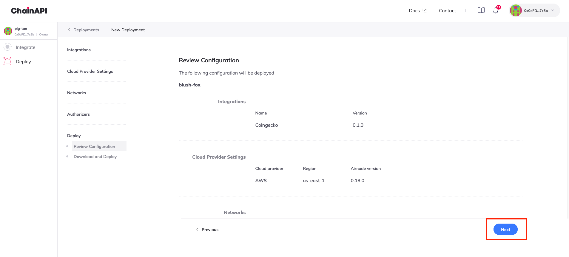 Select the cloud provider you would want to use for your deployment. You can choose between AWS or GCP. Choose the region and the Airnode version and click on Next.