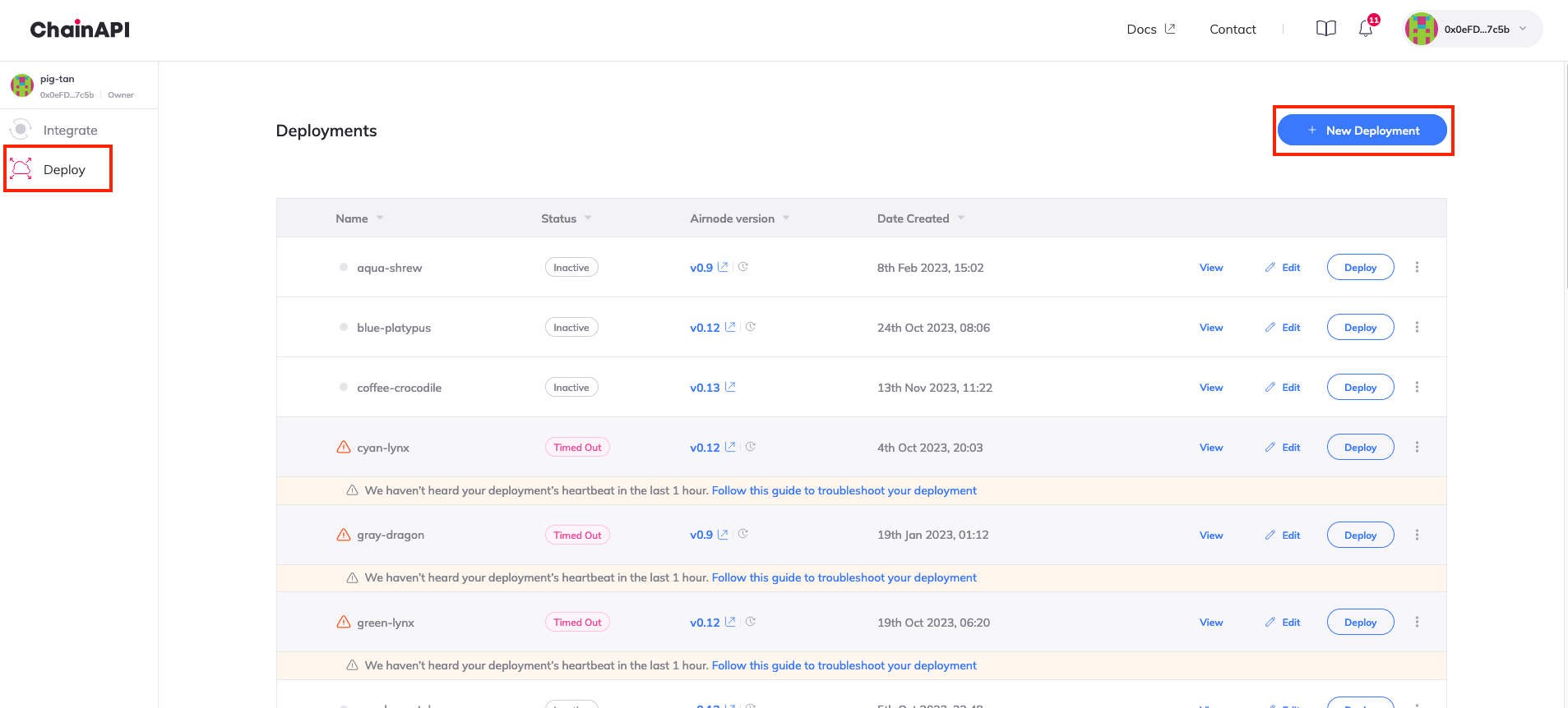 To set up a new deployment for your Airnode, click on the Deploy button on the top left corner of the dashboard and select New Deployment.
