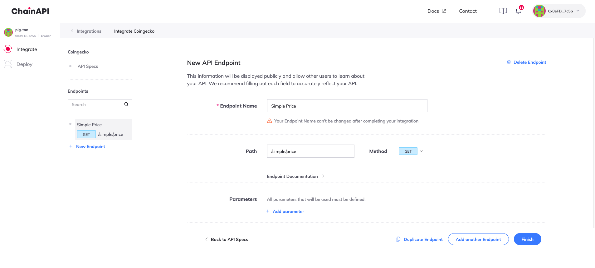You will now be redirected to the next step where you can add your API endpoints. For each endpoint you want to add, click on Add Endpoint and enter the endpoint name, path, method, and description.